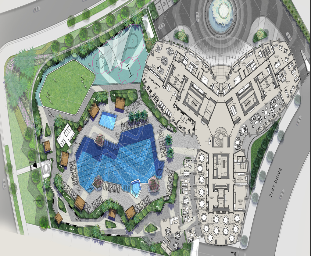 Premium Amenities: 50-meter lap pool, landscaped gardens, fitness center, spa, and private function rooms.