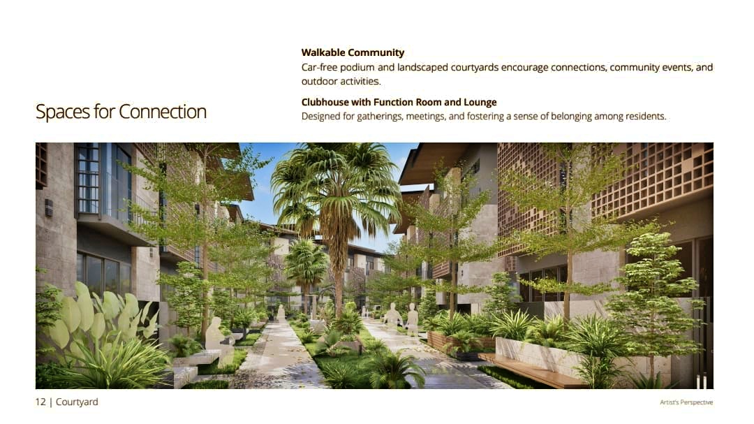 Car-free [podium and landscaped courtyards encourage connections, community events, and outdoor activities