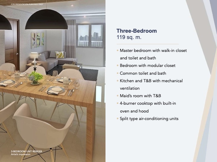 4 and 5 bedroom PenthousePenthouse –  4 and 5 bedroom units at Park Mckinley West include a master’s bedroom with full bathroom with bathtub, three and four additional bedrooms and shared common bathroom, a functional kitchen attached to a maid’s quarters with a dedicated toilet, and finally, a spacious living and dining area.